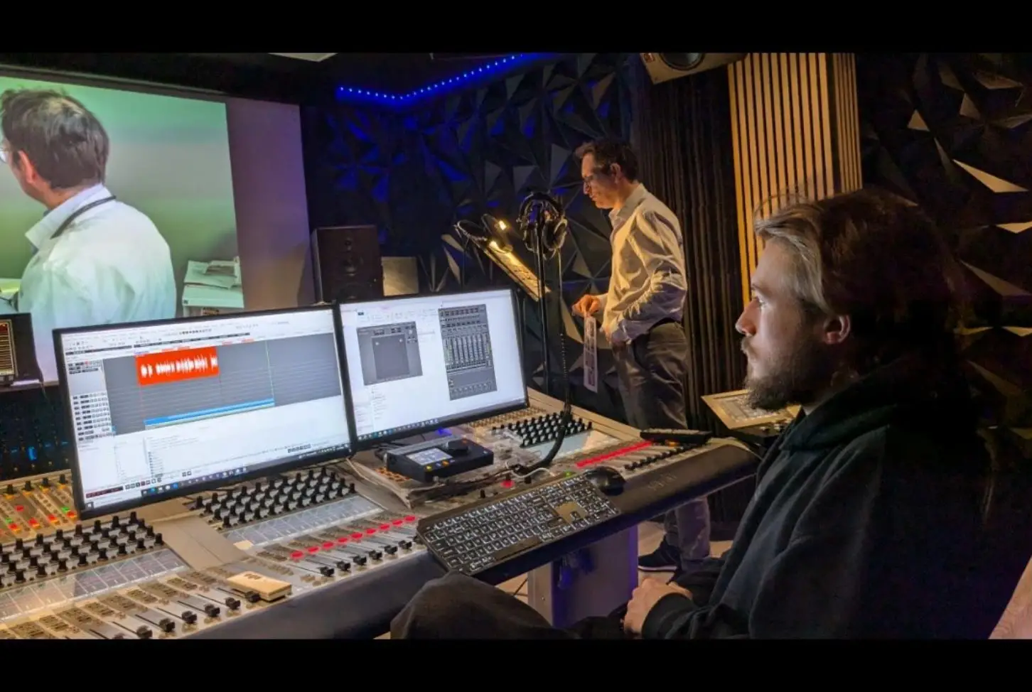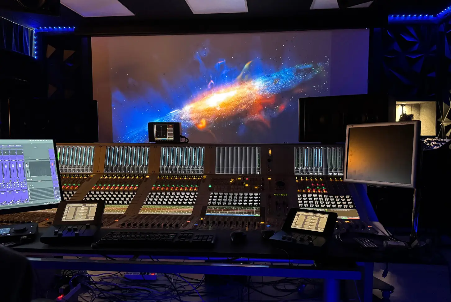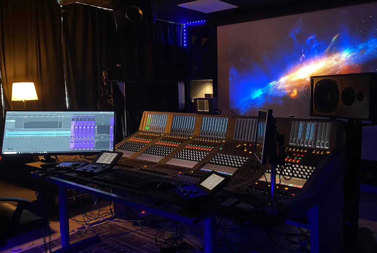 La salle est équipée d'une console fairlight de chez Blackmagic design et un système de diffusion 7.1.4 La salle peut acceuillir 6 personnes et l’ingénieurs du son.
