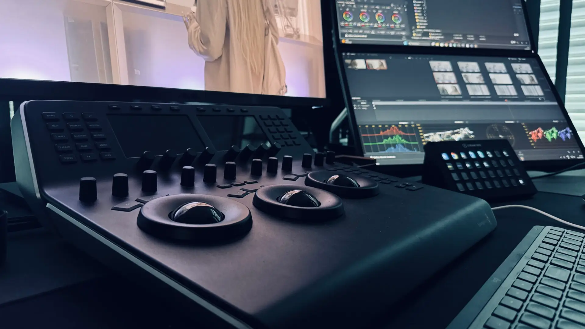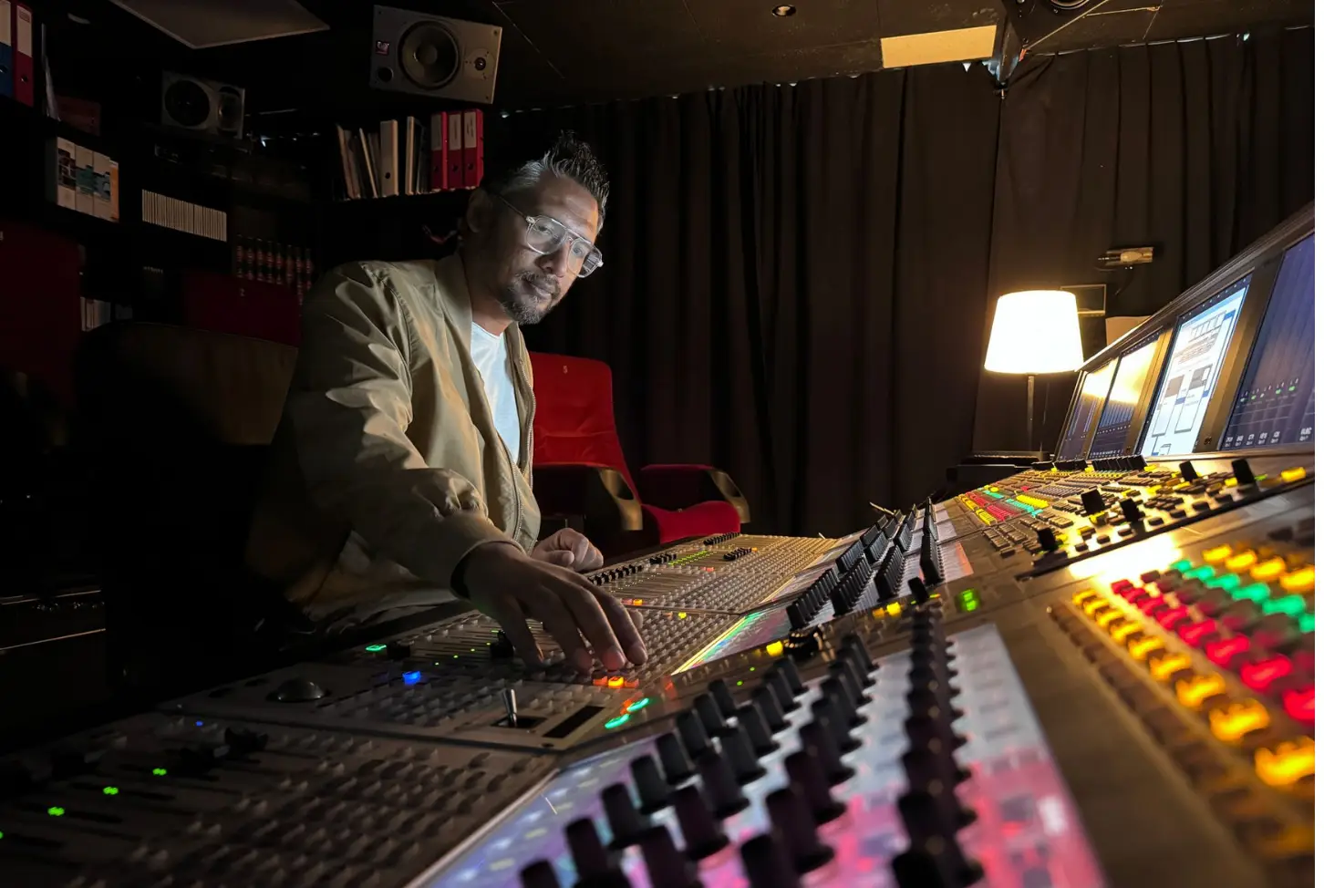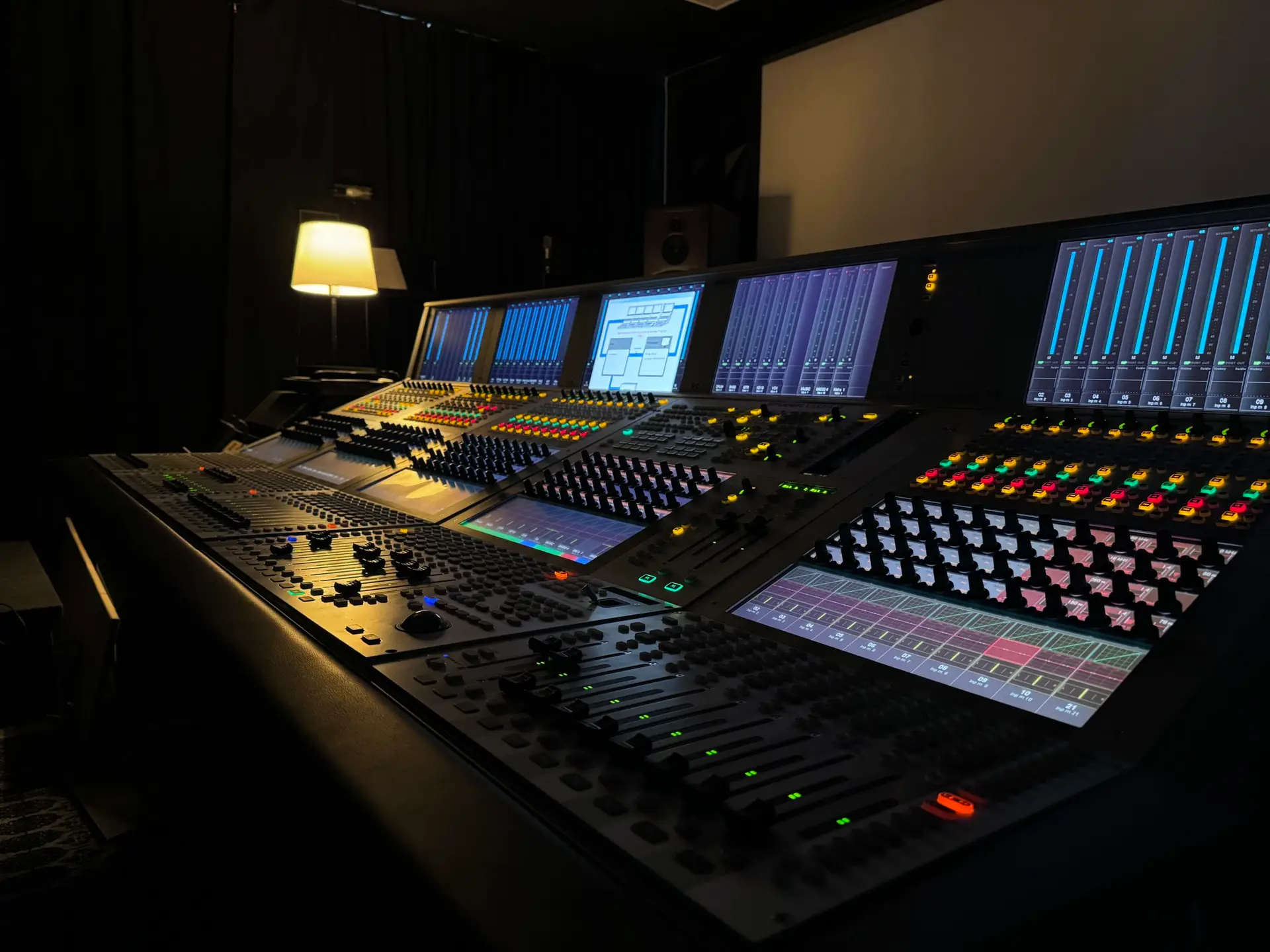 La salle est équipée d'une console fairlight de chez Blackmagic design et un système de diffusion 7.1.4 La salle peut acceuillir 6 personnes et l’ingénieurs du son.
